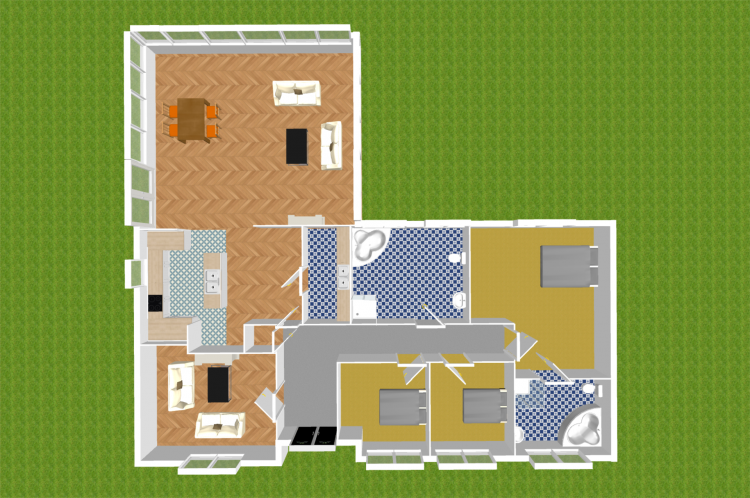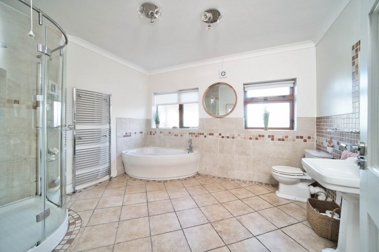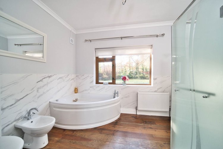 Bathroom 3m x 3.7m Tiled floor, semi tiled walls, Jacuzzi corner bath, w.c., w.h.b., heated towel rail, blinds, fitted mirror, recessed lights and eletric shower.