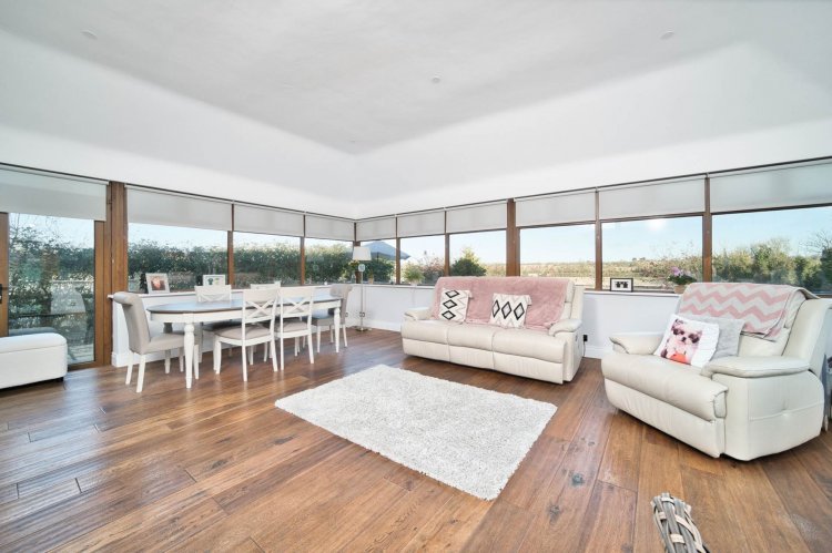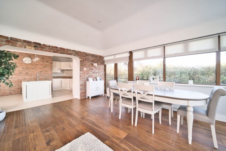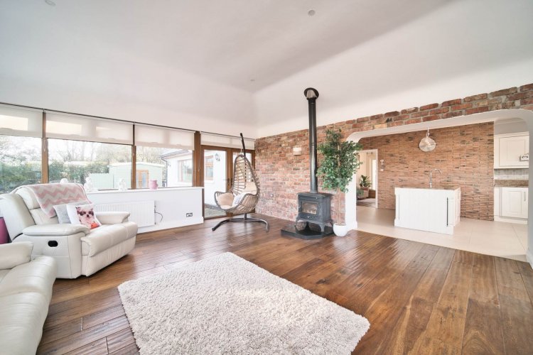 Living/Dining Area 5.97m x 6.87m Hardwood flooring, natural stove with granite hearth and feature red brick wall, two sets of double French doors overlooking the landscape and enclosed raised patio area.