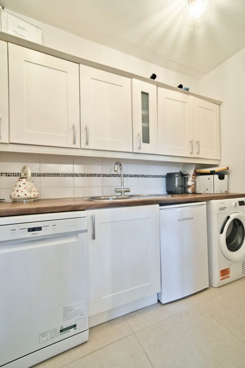 Utility Room 1.47m x 3.47m Fitted wall and floor units, tiled flooring, plumbed for washing machine, integrated shelving, and stainless-steel sink.