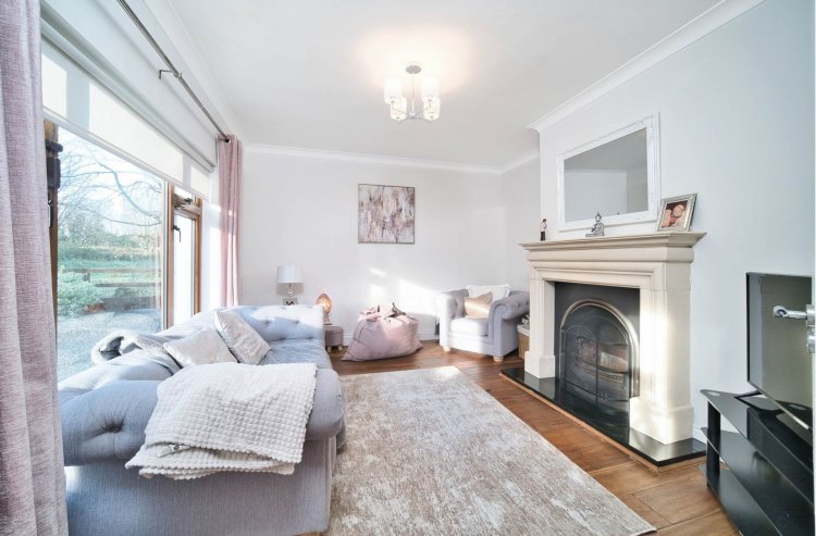 Living Room 4.21m x 3.66m Hardwood flooring, feature stone fireplace with granite hearth, coving, roller blinds and tv point.